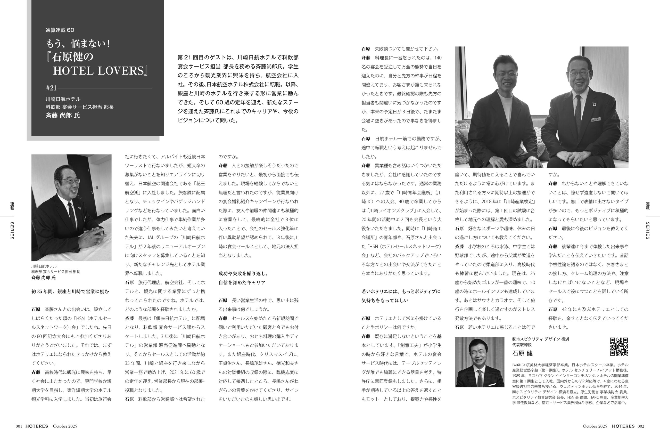 第21回目のゲストは、川崎日航ホテルで料飲部 宴会サービス担当 部長を務める斉藤尚郎氏。学生のころから観光業界に興味を持ち、航空会社に入社。その後、日本航空ホテル株式会社に転職。以降、銀座と川崎のホテルを行き来する形に営業に励んできた。そして60歳の定年を迎え、新たなステージを迎えた斉藤氏にこれまでのキャリアや、今後のビジョンについて聞いた。