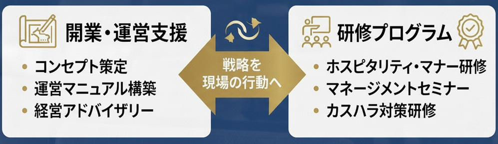 30年に及ぶホテルマネジメントの実績を基に、単なる「知識の伝達」に留まらない、現場に深く入り込んだ運営支援を行っております。
